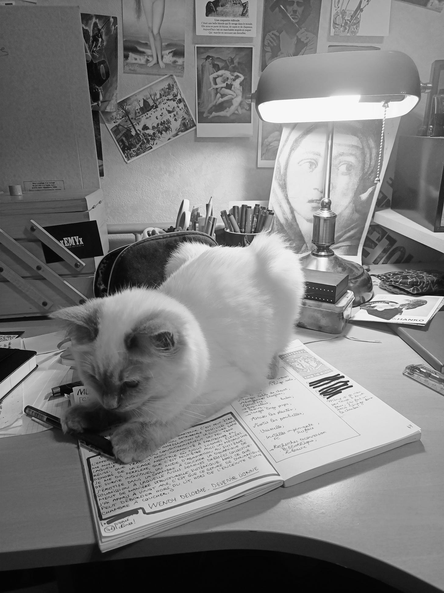 2025 fut une année d’espoirs, et de deuils, terribles. Deuil de la personne que je croyais être ; deuil d’un fonctionnement professionnel ; deuils blancs d’amis, de membres de ma famille, dont j’ai compris que, malgré l’amour que je leur portais, nous ne nous faisions plus que du mal, et que la rupture sèche était devenue vitale. Deuil d’espoirs, d’avenirs imaginés et rêvés. Tu le sais, mon histoire c’est un chapelet de sales expériences, de celles qui font ouvrir de grands yeux à mes soignants quand je les raconte en récit neutre et factuel, de ceux qui me font qualifier parfois de “courageuse”, même si le courage n’a rien à voir avec ça, on n’a pas le choix en fait de vivre selon les cartes de départ que l’on a piochées. Il y a eu un temps d’identification nécessaire de ces sales histoires, un temps où il a fallu nommer les choses, accueillir les émotions les plus douloureuses pour sortir de la dépersonnalisation totale dans laquelle, pour survivre, je m’étais réfugiée. Ce temps-là est indispensable. Pour autant, je crois qu’il ne peut durer éternellement, il faut que l’on avance. J’ai perdu mon souffle à force de pleurer. Je me suis sentie devenir égoïste et détestable, tant ma douleur parfois m’aveuglait à celle des autres. Alors, j’ai adopté un chat.